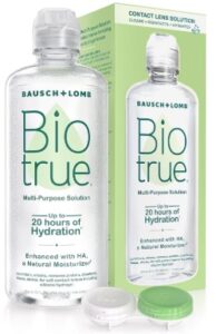 - MULTI-PURPOSE SOLUTION: Biotrue contact lens solution can be used to store, clean, and disinfect contacts in a lens case when not being worn, or to rinse contacts before wear. Available in 2 fl oz bottles, 4 fl oz bottles, 10 fl oz bottles, and packs of two 10 fl oz bottles. For soft contact lenses including silicone hydrogel lenses. BIO.0050.USA.23