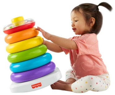 The classic Fisher-Price stacking toy becomes extra-large -over 14 inches tall!6 colorful rings for your baby to grasp, shake, stack, and exploreShake the top ring for fun rattle soundsWobbly, bat-at baseFosters fine motor skills, gross motor skills, and problem-solving skills for infants and toddlers ages 12 months and older