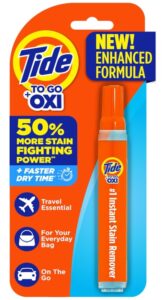 Tide to go is an instant stain remover designed to help eliminate some of the toughest fresh food and drinks stains by getting to them before they set inPortable, pen-like design to stop stains on the spot – fits neatly into briefcases, purses, drawers, or car compartmentsNo mess, nothing to throw away, nothing to get on hands, and no bleach!Works well on tomato juice, ketchup, BBQ sauce, grape juice, coffee, wine, tea, chocolate syrup and moreUsage instructions: remove excess residue from stain, press tip onto stain to release desired amount of solution, rub tip gently across the stain to remove it, when necessary repeat process
