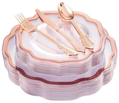 【HEALTH MATERIALS】These rose gold plates are made of 100% food grade, non-toxic and BPA Free plastic. They don’t tear when cutting food, and they don’t droop when they’re filled with liquid or sauce. Specially designed curved edges prevent spillage. which is a great disposable dinnerware set that can be used at any time in daily life.【PERFECT SUIT】Disposable plastic rose gold dinnerware, equipped with 30 high-quality disposable 10 inch plates, 30 high-quality disposable 7 inch salad/dessert/appetizers plates, 30 knives, 30 forks and 30 spoons. The clear plastic plates with rose gold rim match well with the rose gold silverware on the table makes your event an elegant modern touch.【CLEAN UP AND SAVE TIME】After the party, you can spend more time with your family or friends instead of spending too much time cleaning dirty disposable rose gold plates and cutlery. Use these clear rose gold plates can not only save cleaning time, but also enjoy the decoration and elegant accent they add to your dining table. That’s very desirable.【DIVERSE USAGE SCENARIOS】The specially designed of these rose gold trim plastic plates makes you feel noble and elegant. They can be installed in different places for daily meals, birthdays, families, parties, weddings, holidays and many other occasions.【BEST SERVICE】If you encounter problems during the purchase of these clear and rose gold plastic plates or after purchase, please contact us. We will provide you with appropriate solutions in time to avoid unnecessary losses.