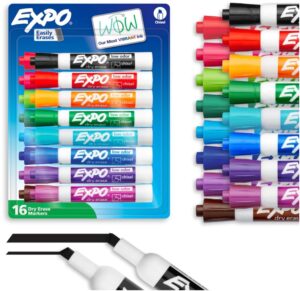 Bright, Vivid Colors: Intensely brilliant colors create eye-popping impressionsSustainable Use: Marks on paper, plastic, metal, and most other surfacesDurable & Quick-Dry: The ink dries quickly and resists fading and waterAP Certified: Safe and suitable for all usersVersatile: Chisel tip markers make impressively bold, detailed marksCore Product: Expo is known for their original permanent markersLarge Pack: Set includes 16 dry erase markers in assorted colors
