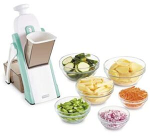 • The perfect wedding or new home gift, the mandoline’s small size takes up little counter or cupboard space, and is a great addition to anyone’s kitchen!