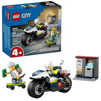 - LEGO CITY MOTORCYCLE TOY – Young builders 4 years old and up can help the police officer minifigure chase down a sneaky crook minifigure trying to steal money from the city ATM with the LEGO City Police Motorcycle Chase (60455) building toy for kids