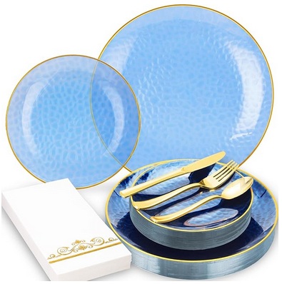 Elegant Gold Trim Design – Clear baby blue plates body with exquisite gold rim, just like the ocean clear dream, instantly enhance the party style, let your party become the focus of the circle of friends! The fancy disposable dinnerware allows the food to take center stage, whether it is colorful fruit salad, or exquisite and delicious desserts, can be presented perfectly, stimulate the appetite, make the party atmosphere more enthusiasticStunning Light Blue Translucency – Unique Stacked Effect! Each plate is a beautiful light blue, but due to our special translucent material, they create an elegant deep ocean blue gradient when stacked together. This captivating color shift is a signature feature, not a flaw! Enjoy the individual vibrant light blue or the sophisticated stacked lookNice Disposable Plates Set for 25 Guests – This elegant disposable dinnerware set is specially prepared for 25 guests, including: 25 10 inch blue plastic dinner plates, 25 7 inch blue dessert plates, 25 high-quality napkins, and 25 sets of gold plastic silverware (forks, knives, spoons). There is no need for additional purchases, streamlining preparations, so that you can easily enjoy the party time and focus on the wonderful moments with your guestsDurable & Lightweight – Made of high-quality plastic, the nice disposable plates are sturdy and durable, and can easily carry hearty dishes while remaining lightweight and easy to carry. Whether it’s a backyard barbecue, a formal dinner party, or a cozy family get-together, this fancy plastic plates disposable is perfect for the occasion and saves you from tedious cleanupEasy Cleanup – Say goodbye to post-party cleanup! The blue plastic plates for party design makes it quick and easy to clean up after a meal, so all you need to do is throw it away and you’ll have more time to chat and laugh with your friends and family. It’s perfect for busy hosts, so you can focus on making memories instead of washing dishesVersatile Use for Any Occasion – From birthday parties to holiday celebrations, from weddings to outdoor picnics, this blue plates and napkins party supplies is the perfect fit. Whether it’s a formal occasion or a relaxed gathering, it will add a memorable touch of ceremony to your event. Our blue plastic disposable plates can be used as baby shower plates,happy birthday plates, wedding plates, retirement plates, graduation plates, patriotic plates, Father’s Day plates, memorial day plates, 4th of July plates, Christmas plates and more.