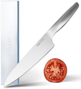 • PREMIUM HOME GIFT WITH GIFT PACKAGING: The Hast 8 inch chef knife comes in a luxurious silver paper box with an Apple-style design that gives off minimalist sophistication. Its premium satin finish adds the perfect final touch to the knife’s sleek, modern appearance, offering a luxury gift for any occasion—birthdays, weddings, housewarmings, and more.
