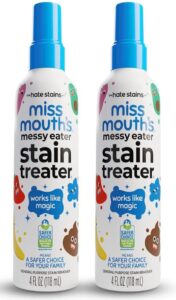 - EASY TO USE: First, ditch the excess gunk and dampen dry stains with a splash of water. Spray on Miss Mouth’s, give it a little rub if needed, then toss it in the wash or clean as usual. Still see the stain? Hit repeat. Easy peasy.