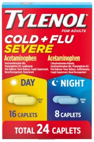 - 24-count combo pack of Tylenol Cold + Flu Severe Day/Night Caplets for multi-symptom cold and flu symptom relief. From the #1 doctor recommended pain relief brand, the combo pack includes 16 Daytime and 8 Nighttime caplets for relief any time of the day