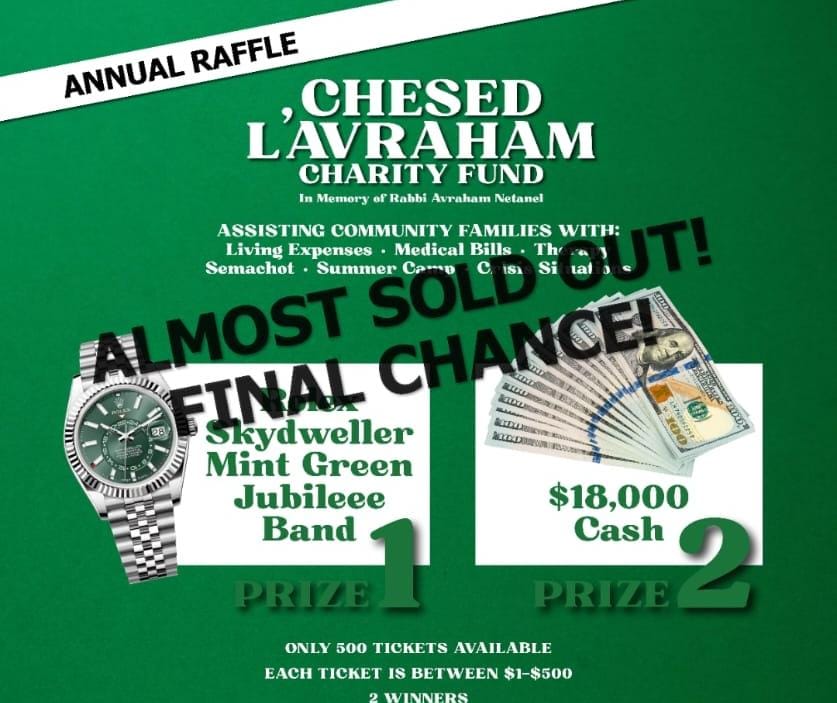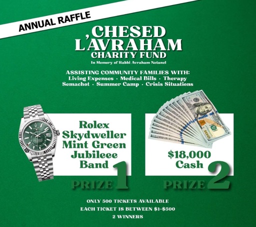 2 Prizes! 2 Winners! Rolex Skydyeller Watch and $18,000 – Enter The Chesed L’Avraham Raffle For As Low As $1