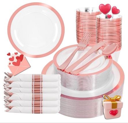 Amazon has the Liacere 350PCS Rose Gold Plastic Plates – Clear with Rose Gold Rim for 50Guests Dinnerware – Include 100 Plates disposable 150 PCS Silverware 50 Napkins for Wedding & Party & Valentine’s Day $46.99. Plus you add coupon code: HJBSYTUR to bring the price down to only $32.99.