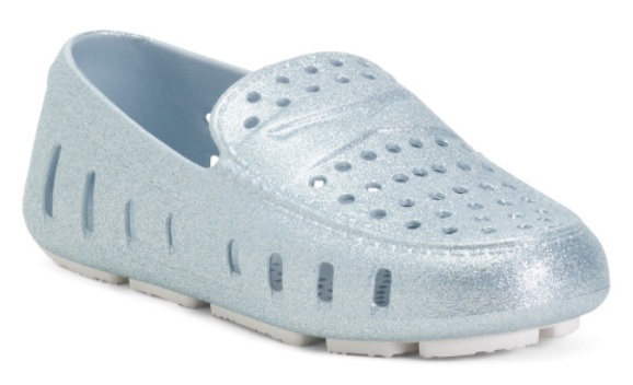 - Glitter finish, perforated accents, grip sole