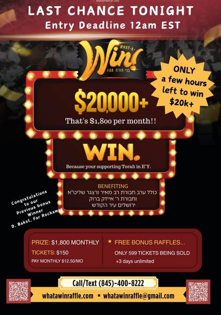 Win Over $20K ($1,800 A MONTH FOR A YEAR) – SUPPORT TORAH IN YERUSHALAYIM!