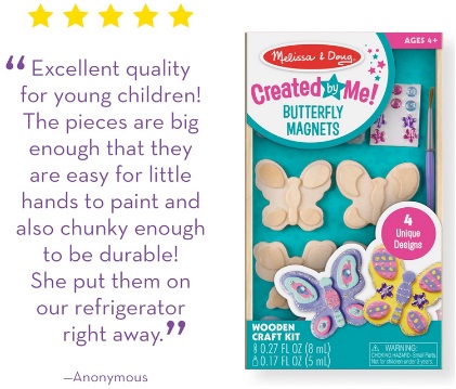 - ALL-INCLUSIVE DECORATING KIT: The Melissa & Doug Created by Me! Butterfly Magnets Arts & Crafts set is a fun-to-create decorative magnet set. It includes preassembled wooden magnets, paints, stickers, plastic gems, glitter glue, and a brush.