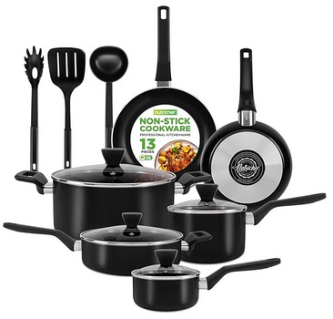 Amazon has the NutriChef 13-Piece Nonstick Cookware – Heat Resistant Kitchen Ware Set w/Saucepan, Frying Pans, Cooking Pots, Casserole, Lids, Ladle, Fork, Strainer – NCCWA13, Black down to only $54.70 + Free shipping (was $89.99)!