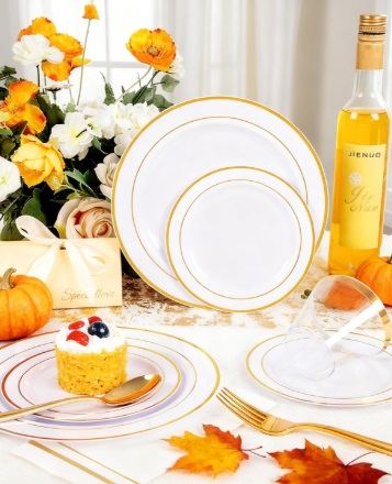 CONVENIENT DISPOSABLES: No need to worry about tedious cleaning with these white and gold plastic plates, all cutlery and cups are disposable and easy to dispose of after use, making your party prep and cleanup more convenient.