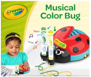 CRAYOLA MUSICAL COLOR BUG: Includes (1) Colorbug Toy with 8 different pre-programmed sounds, (15) giant 20”x 11” Blank Coloring Sheets in an easy-to-use perforated roll, and (8) Ultra Clean Washable Markers that wash from skin, fabric, and walls.